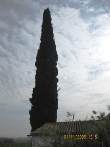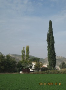 A los viajes en el autobús de línea a Zaragoza, cuando éstos eran de regreso a Zuera, tengo asociado el descubrimiento del ciprés del Molino. Los últimos kilómetros de la carretera antes de acceder al pueblo aparecían, todavía lo están, una serie de cambios de rasante, y recuerdo que al sobrepasar alguno de ellos aparecía por primera vez a la vista aquel impresionante ciprés, que hoy lo es todavía más.