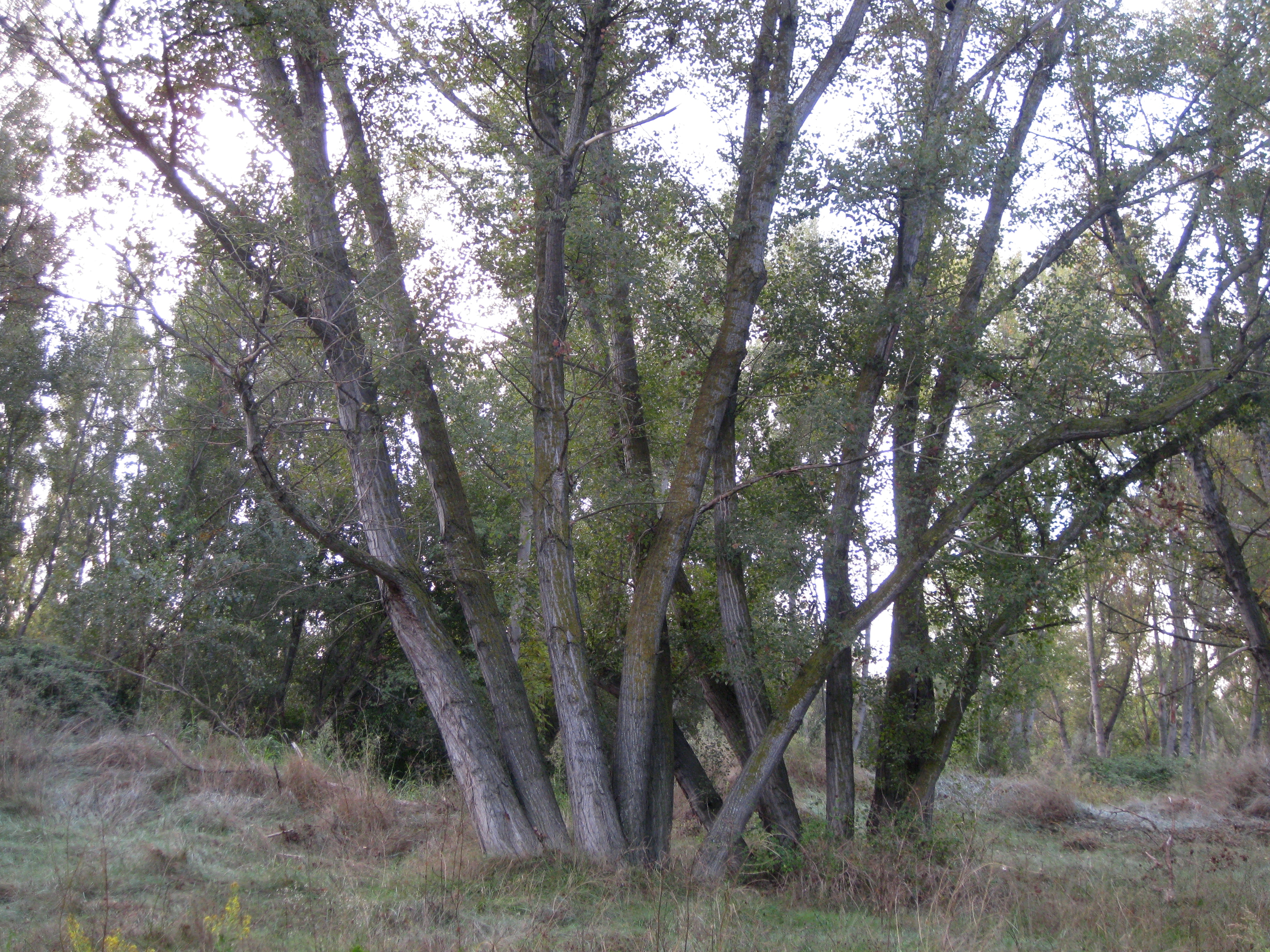 Peculiar es el caso de los chopos de la imagen. Siempre que paso ante ellos, me asalta la duda de si están unidos por algún vínculo genético que les impulsó a crecer juntos y entrecruzarse ociosa y cordialmente o si, por el contrario, lo que hacen en realidad es empujarse y competir obstinadamente por el mismo espacio. De cualquier manera, siempre que los miro, sea cual sea la estación del año, siento el impulso irresistible de detenerme y dirigirme a ellos con tono confiado y amistoso. No en vano, hace tiempo que vienen siendo testigos fieles de mis permanentes cavilaciones.