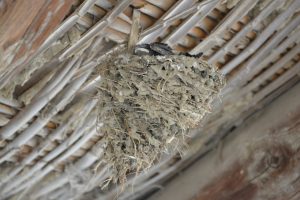 Mientras todo esto acontecía, se abalanzó sobre nosotros ese calor sofocante que nos ha acompañado a lo largo del mes de junio y la situación adquirió una nueva perspectiva, un posible nuevo enfoque. El aspecto tosco y vetusto de la obra ponía de manifiesto que la pareja no había calculado bien los tiempos. Sin embargo, habían sido muy perspicaces en cuanto a la previsión meteorológica. Toda la peripecia constructiva parecía adquirir sentido. Al permanecer la estructura exenta a la techumbre del cubierto, el aire circula libremente entre ambas proporcionando a las inquilinas un sistema de refrigeración natural digno de la mejor ingeniería. Toda una genialidad que permitirá crecer a las crías libres de los agobios que sin duda estarán pasando sus hermanas. Está por ver si cuando las crías crezcan y aumenten de peso la estructura resiste los envites y forcejeos de la familia al completo.