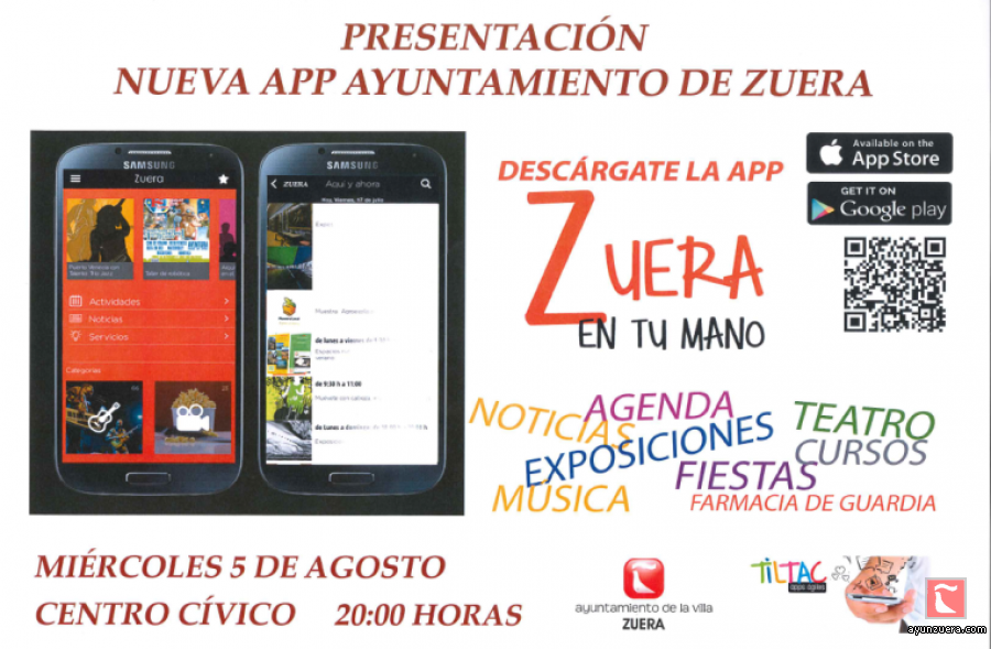 El pasado día 5 de Agosto tuvo lugar en el Centro cívico Villa de Zuera, la presentación de una App para dispositivos móviles, mediante la cual la Corporación municipal desea establecer un contacto permanente con los ciudadanos. Se trata de un sistema con vocación interactiva que permitirá al Ayuntamiento transmitir la información que considere de interés para los ciudadanos y a éstos, a su vez y cuando la aplicación esté más desarrollada, remitir las sugerencias y observaciones que consideren oportunas al Equipo de gobierno municipal.