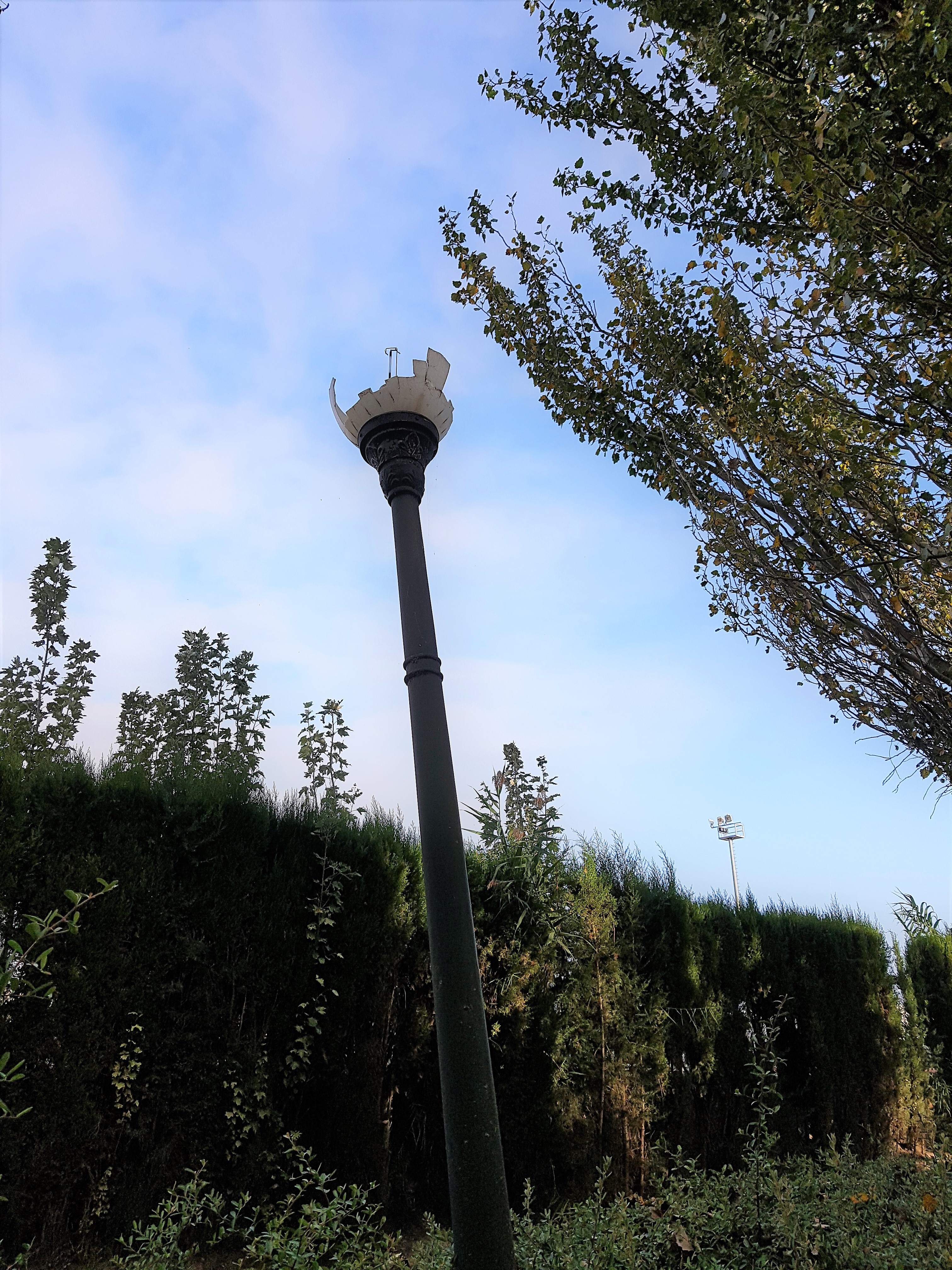 Se me escapan las razones por los cuales esta estampa, que a mí se me antoja una herida en el paisaje, no es subsanada. Al principio pensaba en el descuido, en el desbordamiento de quehaceres, incluso en la falta de recursos económicos para afrontar la tarea. Sobre todo al considerar que su caso no es una excepción, una buena parte de las luminarias del Parque del Gállego están decapitadas. Pero la justificación presupuestaria me resultaba inconsistente. No se me oculta que la insensatez de origen recae en aquellos que llevaron a cabo los incívicos actos de vandalismo, pero aludo a una situación que aconteció hace no menos de seis o siete años. Hubo un tiempo que dejándome llevar por la suspicacia llegué a pensar en la desidia e incluso, finalmente, en la contumacia. En ese placer morboso que a algunas personas les produce mantenerse en el error. Dejémoslo ahí. Simplemente parto de la idea de que a través del olvido y la indiferencia a menudo se cuela el retroceso y la decadencia. Y en contra de lo que pudiera parecer, no es un tema menor. Los procesos de degradación y empobrecimiento no surgen por generación espontánea. Son trazados sutiles que arrancan de alteraciones en las escalas de valor, modifican la capacidad perceptiva y generan cambios en el orden de prioridades. Si así fuera, resultaría preocupante. Pero, quién sabe, a lo mejor es una ilusión mía, al fin y al cabo vivimos una época en la que no dejan de abrirse paso las post verdades.