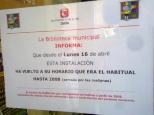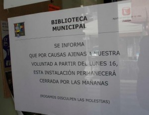 Recientemente han pasado ante mis ojos un par de carteles referidos al cierre de la biblioteca municipal en horario de mañanas, en los que me ha apetecido recrearme un rato.