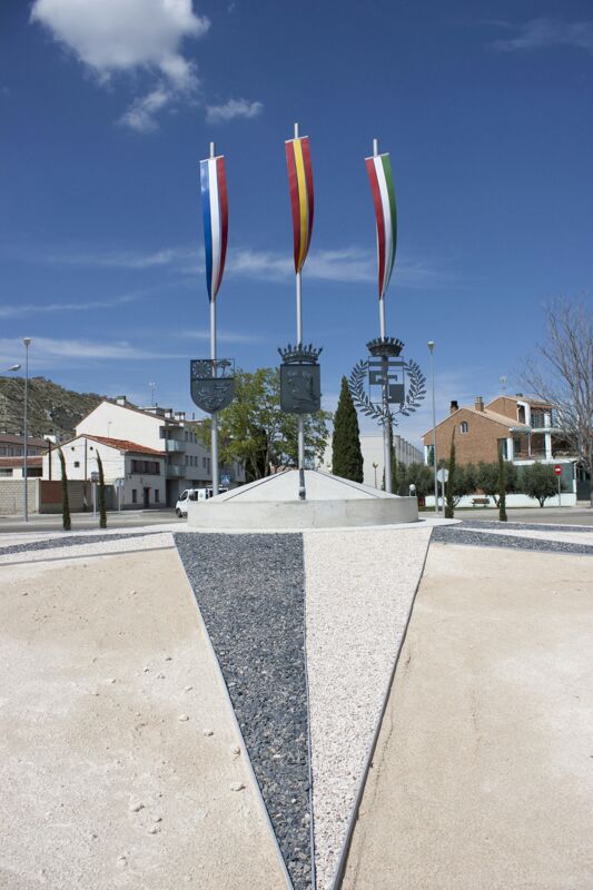 De la obra, llama poderosamente la atención, entre otras, la consistencia y solidez de los materiales empleados, piedra, hormigón y hierro, concebidos todos ellos para desafiar cualquier tipo de elemento meteorológico y, muy en particular, el cierzo. Tal vez, podría reprochársele que a un elemento tan sugerente y simbólico como son las banderas no se les permita mecerse y susurrar al son del viento, acompañando a los cipreses en su sensual y bamboleante contoneo. El movimiento introduciría de esta forma un contrapunto en la rigidez de los elementos exentos que sin duda haría del conjunto un fundido más equilibrado y emblemático.