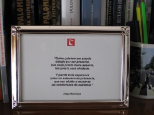 Hace muchos años –porque ya hace tiempo que gozo de esa licencia- clavé en el panel de mi despacho esos versos de Jorge Manrique que, consciente y voluntariamente me han acompañado hasta el día de hoy. No sé en que momento una buena amiga tuvo la espontánea y amable gentileza de arrancarlo y devolvérmelo en un sencillo marco de plata, que ha gozado de ubicación preferente en todas las mesas desde las que he tenido la oportunidad de “oficiar” al servicio del interés público. Estoy seguro de que no hay un texto en el universo literario que haya releído más veces a lo largo de mi vida. De ahí que llegado el momento de orientar mi actividad profesional hacia nuevos horizontes, no sienta ni apego, ni frustración ni, mucho menos, nostalgia alguna de lo que fue o pudiera haber sido. Por lo visto, también interioricé lo del afán de cada día.